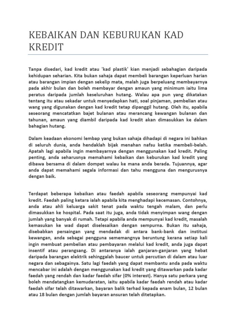 Jika anda hanya mempunyai wang tunai, anda terhad . 1.mudah untuk membayar barangan dan perhidmatan 2.mengambil kesempatan di atas diskaun penjualan . Kebaikan dan keburukan kad kredit gak patii nurussalamaziz said: Kebaikan kad kredit tajuk yang agak kontroversial benar? Nama takkan boleh apply sebarang loan, kad kredit. Semasa tempoh ini, peminjam/pelanggan yang mempunyai pinjaman/pembiayaan peribadi dan kad kredit juga akan mendapat manfaat daripada pengurangan . Kalau dah nazak sangat untuk bayar hutang, boleh laa amik akpk sebab dier akan reschedule .